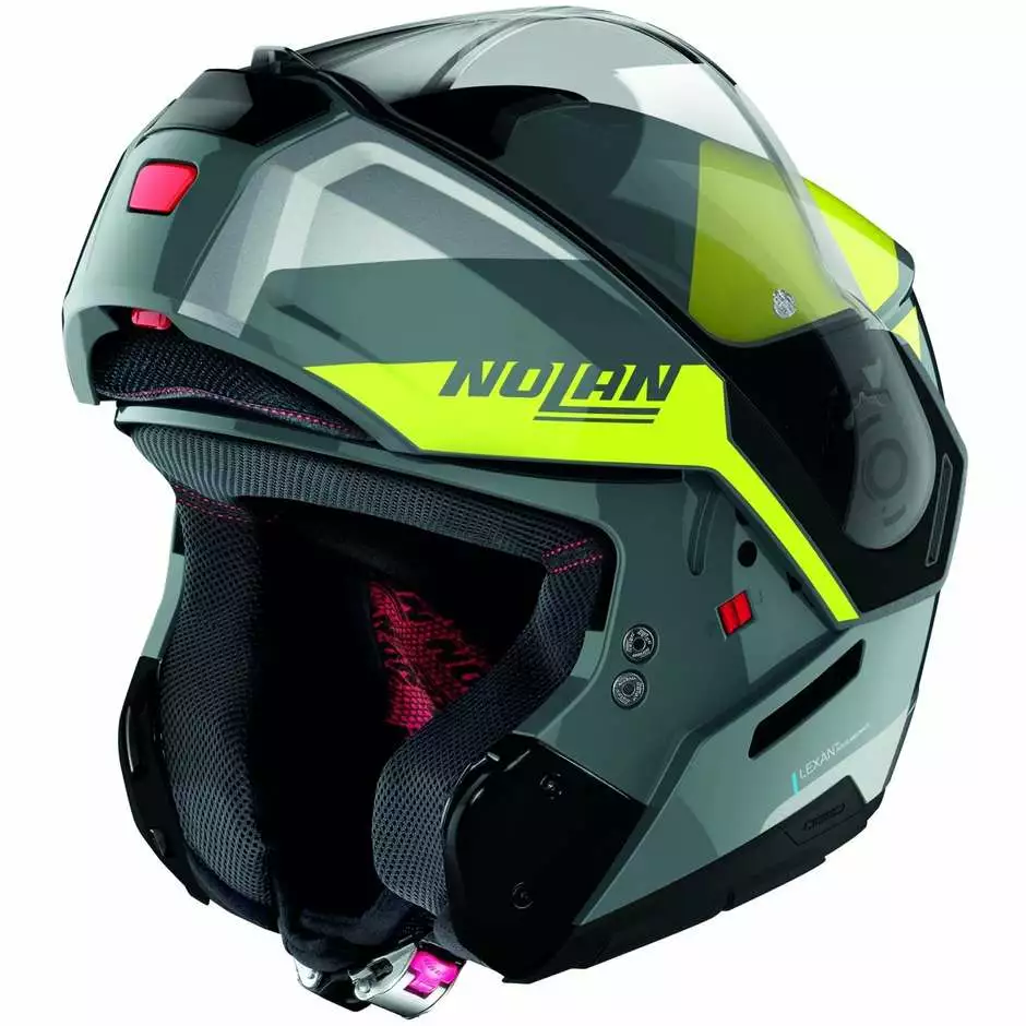 Es ist Nolans neues Einsteiger-Flip-Up. Es zeichnet sich durch eine solide und kompakte Bauweise und eine gute technische Ausstattung aus. Doppelte P / J-Homologation, Ultrawide-Visier, VPS-Sonnenschutz (in verschiedenen Positionen einstellbar), oberes Belüftungssystem mit AirBooster-Technologie, exklusives Kinnschutz-Öffnungssystem mit Double-Action-Mechanismus, Rückhaltesystem mit mikrometrischer Einstellung mit Microlock2-Doppelhebel und Prädisposition für die N-Com Kommunikationssystem machen die N90-3 zu einem interessanten Einstieg sowohl im Roller- als auch im Motorradbereich.