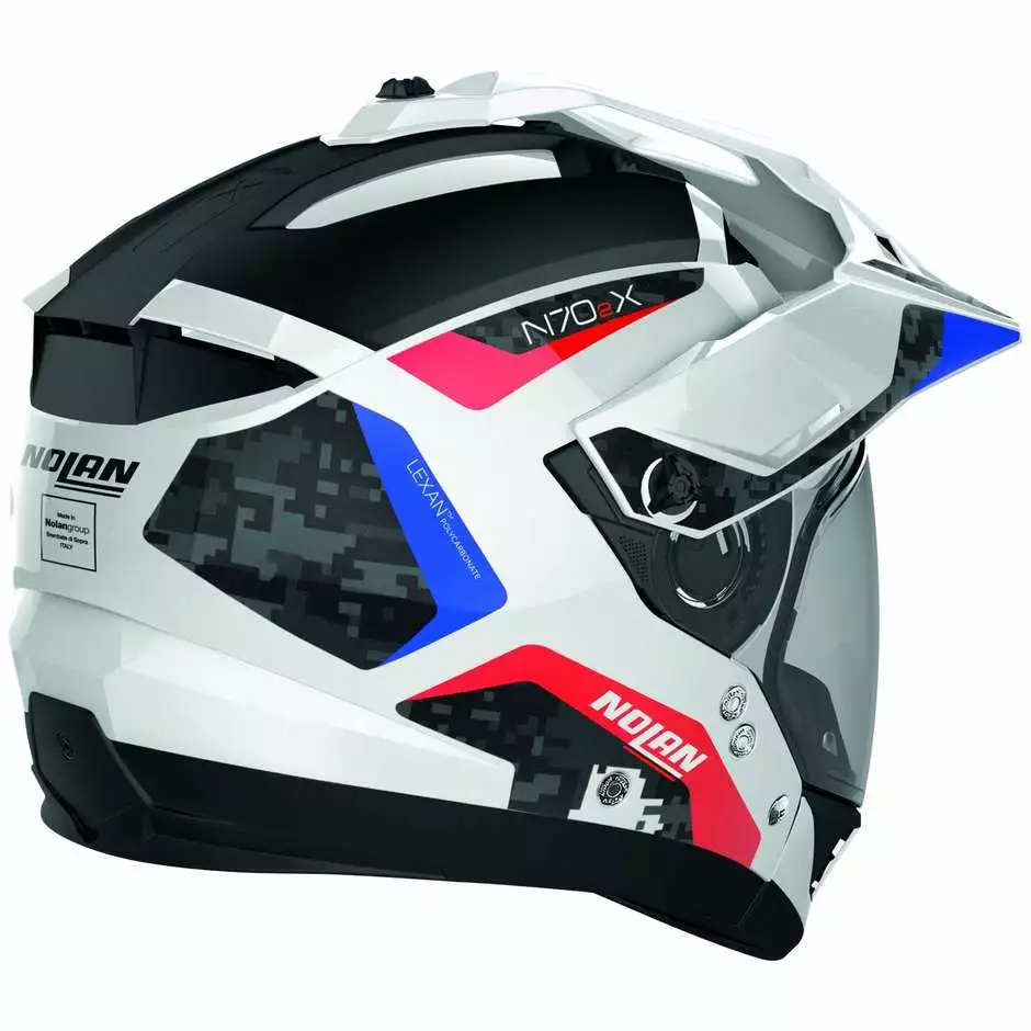 Es ist Nolans erstklassiger Straßen- und Offroad-Crossover, der erste On-Off-Helm auf dem Markt, der mit einem abnehmbaren Kinnschutz ausgestattet ist. Es zeichnet sich durch Offroad-inspiriertes Design, reichhaltige technische Funktionen und eine gute Verfügbarkeit von Farben und Grafiken aus.Geringes Volumen (dank der Verfügbarkeit von zwei Außenschalengrößen), doppelte P/J-Homologation, Ultrawide-Visier, besonders großes Bullauge kompatibel mit der Verwendung der Maske (auch bei montiertem und geöffnetem Visier), VPS-Sonnenschutz (in verschiedenen Positionen verstellbar .) und ausgestattet mit automatischem Rückrufsystem), AirBooster Technology oberes Belüftungssystem, Microlock2-Doppelhebel-Rückhaltesystem mit mikrometrischer Einstellung, innovative Clima Comfort-Innenkomfortpolsterung (mit mikroperforierten Stoffen und verstellbarer Nackenrolle) und Vorkehrung für das Kommunikationssystem N-Com möchten machen die N70-2 X zum Referenz-Crossover für die anspruchsvollsten Touristenmotorräder.